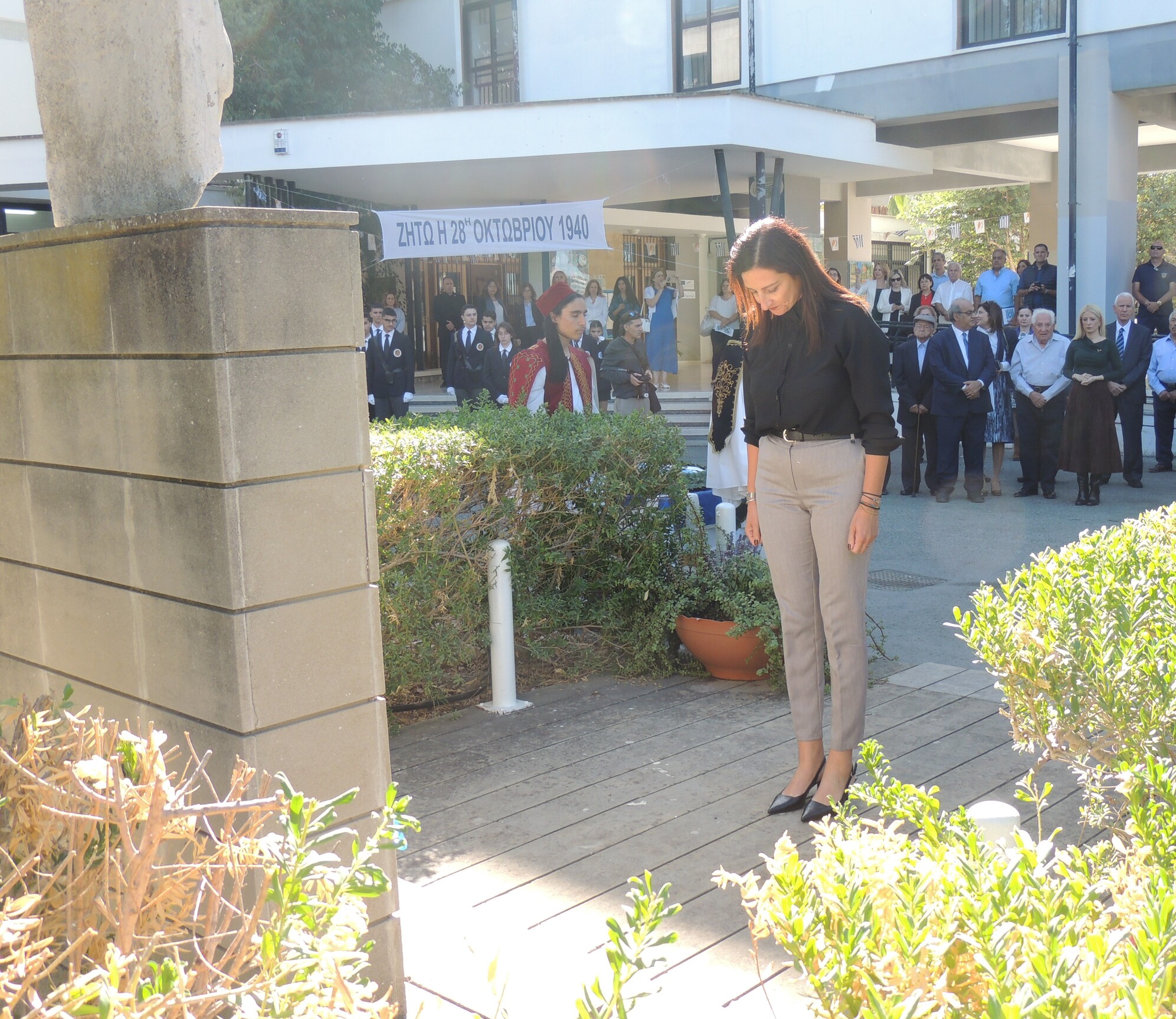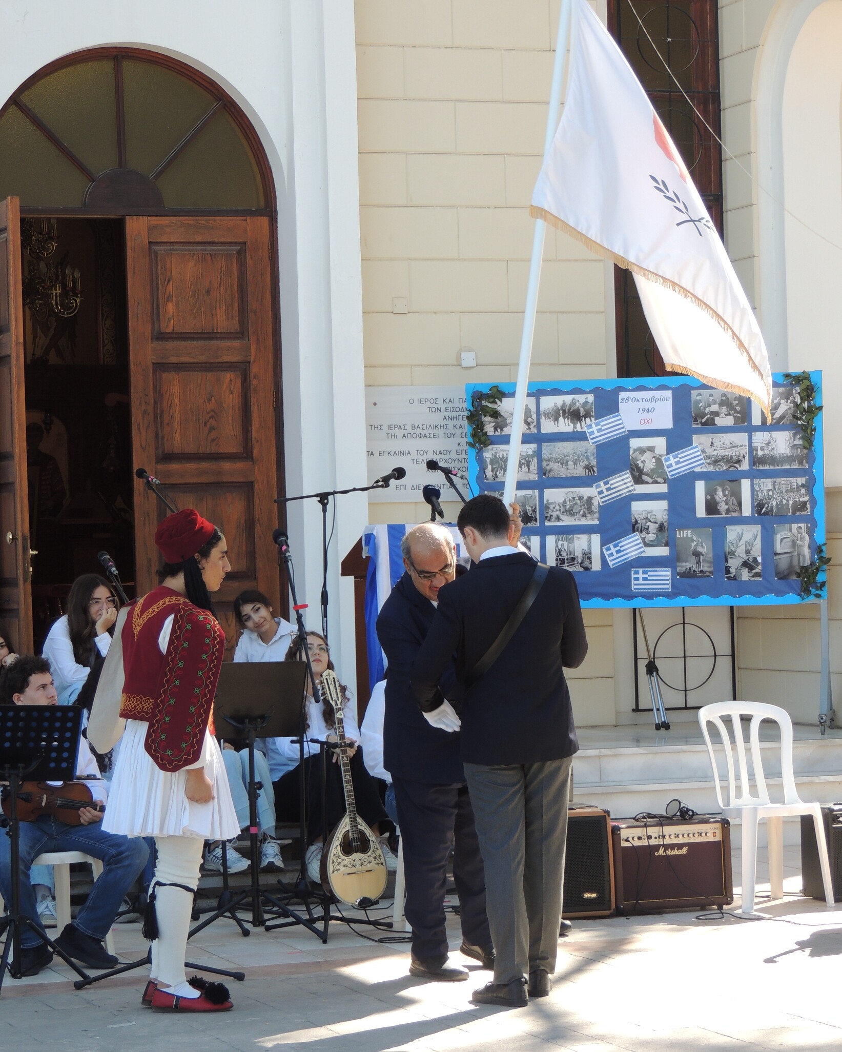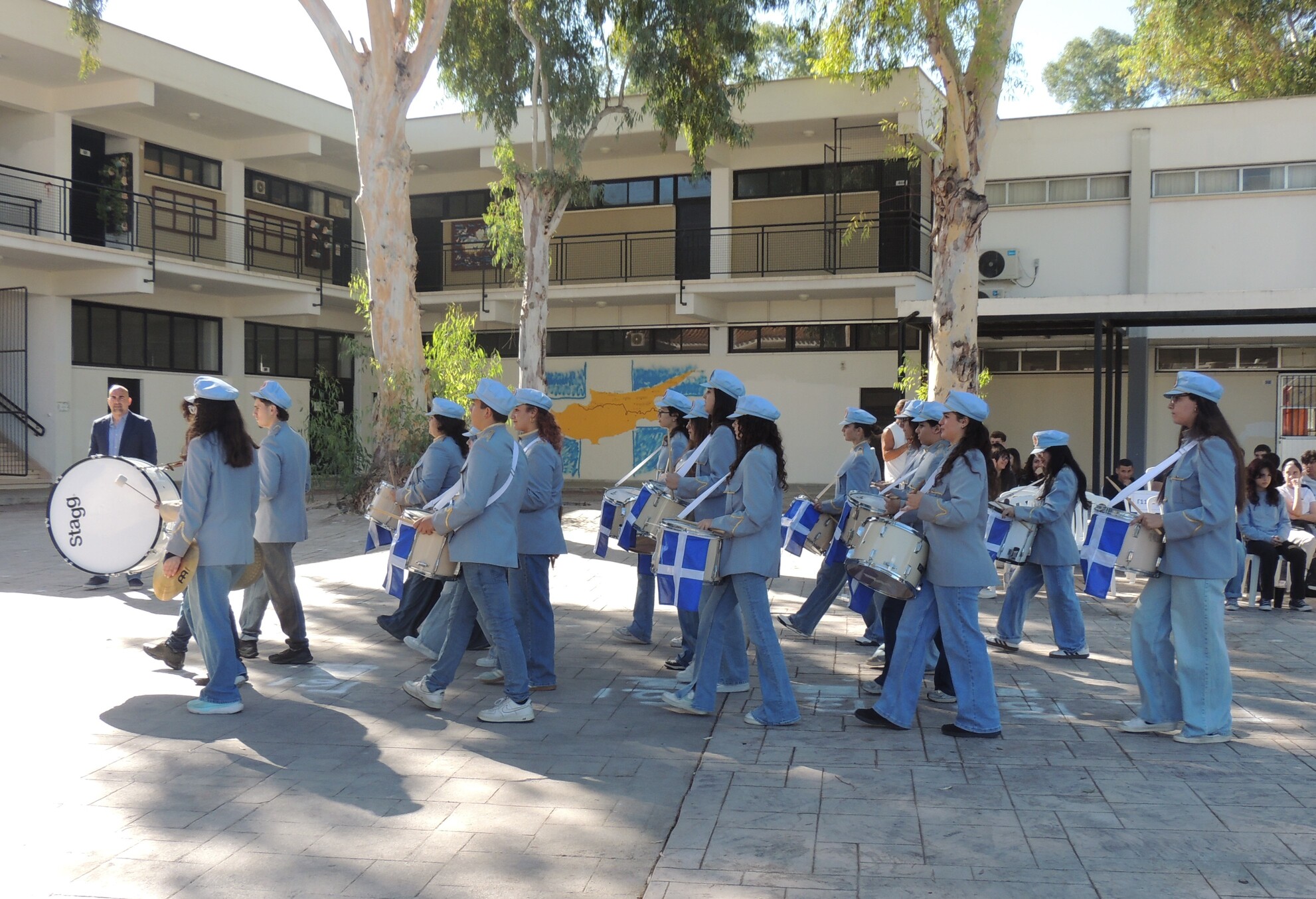 Η εκδήλωση για τον Εορτασμό της Ελληνικής Σημαίας και της Επετείου της 28ης Οκτωβρίου του 1940 γιορτάστηκε με κάθε λαμπρότητα στο Σχολείο μας τη Δευτέρα 27 Οκτωβρίου 2025 στον προαύλιο χώρο της Εκκλησία μας. Οι εκδηλώσεις άρχισαν στις 9:20 π.μ. με την Έπαρση της Σημαίας στο Ηρώον του Σχολείου. Ακολούθησε Τρισάγιο υπέρ των πεσόντων κατά την αντίσταση της Ελλάδας στον ιταλικό φασισμό 1940-41 και κατάθεση στεφάνων στο «Ηρώον». Κατέθεσαν στεφάνια η Πρόεδρος της Βουλής των Αντιπροσώπων κ. Αννίτα Δημητρίου, εκ μέρους του Πρέσβη της Ελλάδας η Ακόλουθος της Πρεσβείας κ. Έφη Εμμανουηλίδου, εκ μέρους του Υπουργείου Παιδείας, Αθλητισμού και Νεολαίας, ο Πρώτος Λειτουργός Εκπαίδευσης, κ. Γιαννάκης Χατζηκωστής, εκ μέρους της ΕΛΔΥΚ, ο Διοικητής της, Συνταγματάρχης Πεζικού κ. Αστέριος Δεσπούδης, εκ μέρους του Αρχηγού της Αστυνομίας, ο Υπαστυνόμος κ. Πάμπος Χαραλάμπους, εκ μέρους των Συνδέσμων Αγωνιστών ΕΟΚΑ, ο Πρόεδρός τους κ. Γιάννης Σπανός, εκ μέρους της Σχολικής Εφορείας Ελληνικών Εκπαιδευτηρίων Λευκωσίας, ο Πρόεδρος της κ. Νίκος Μεγάλεμος, εκ μέρους του Συνδέσμου Γονέων και Κηδεμόνων του Σχολείου μας, η Αντιπρόεδρός του κ. Χριστιάνα Παύλου και ο Διευθυντής του Λυκείου μας, κ. Δημήτρης Ταλιαδώρος.