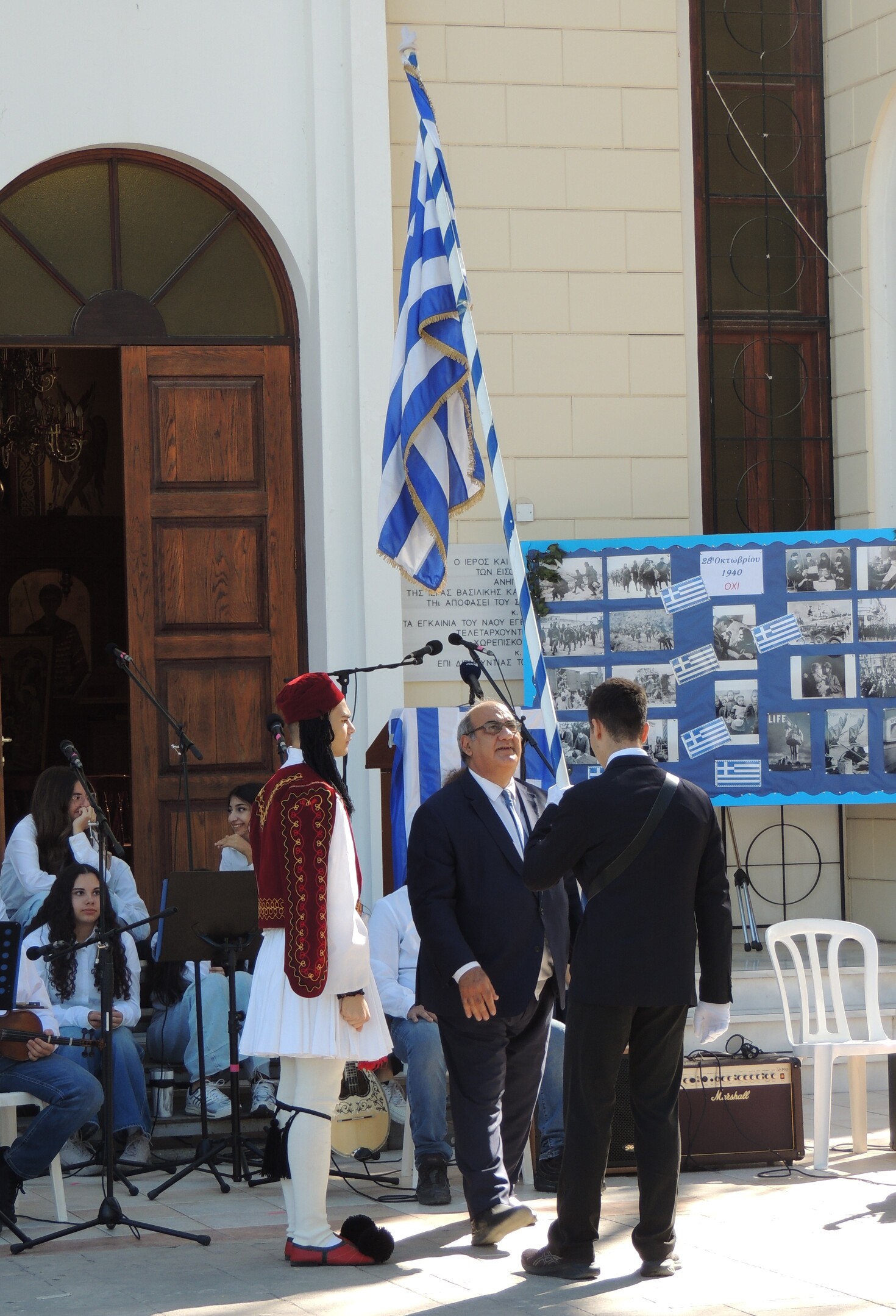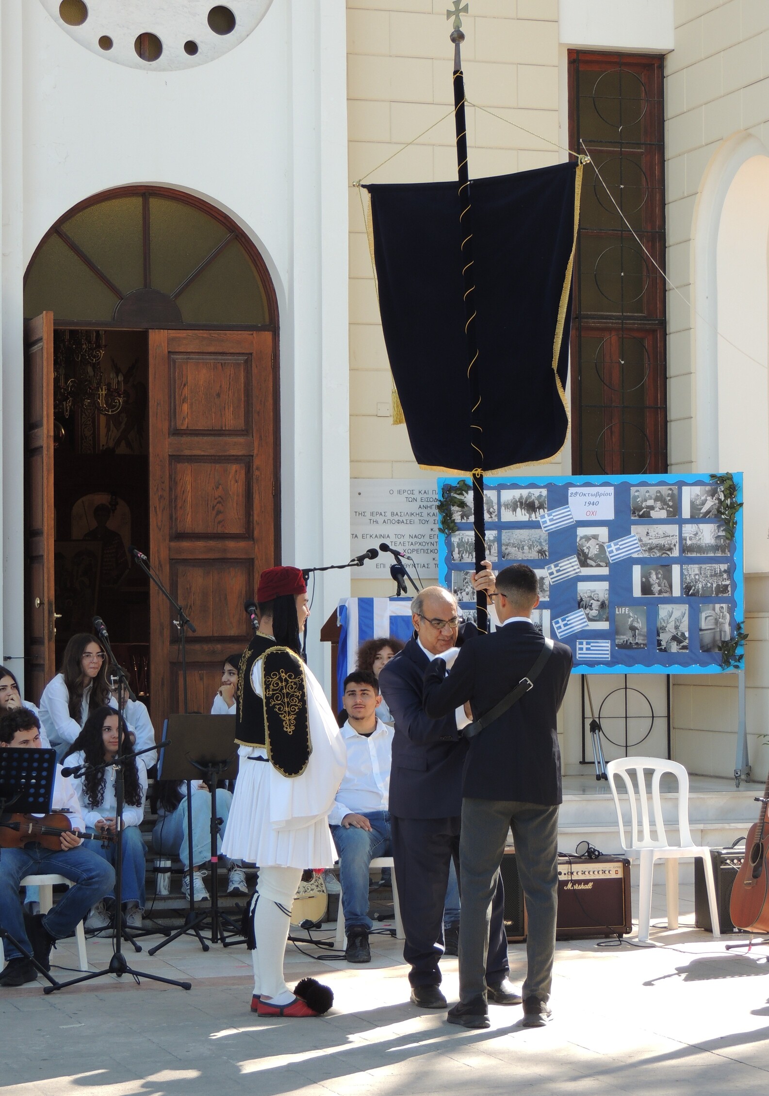 Έγινε προσφώνηση και παράδοση του Λαβάρου και των Σημαιών από τον Διευθυντή του Σχολείου κ. Δημήτρη Ταλιαδώρο. Ο λαβαροφόρος του Σχολείου, Παπαντωνίου Έκτορας του Γ32, εκφώνησε τον Όρκο στη Σημαία. Ακολούθως, έγινε περιφορά του Λαβάρου και των Σημαιών κατά την οποία παιάνιζε η Μπάντα του Σχολείου.