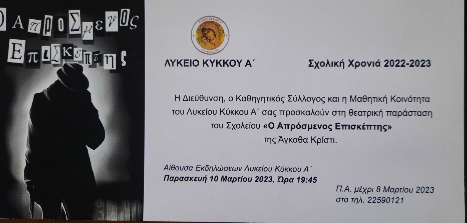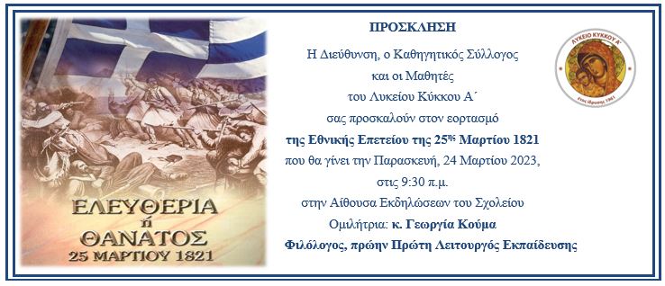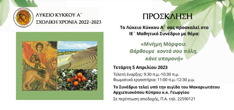 Παρασκευή, 24 Μαρτίου 2023 στις 9:30 πμ στην Αίθουσα Εκδηλώσεων του Λυκείου Κύκκου Α'. |