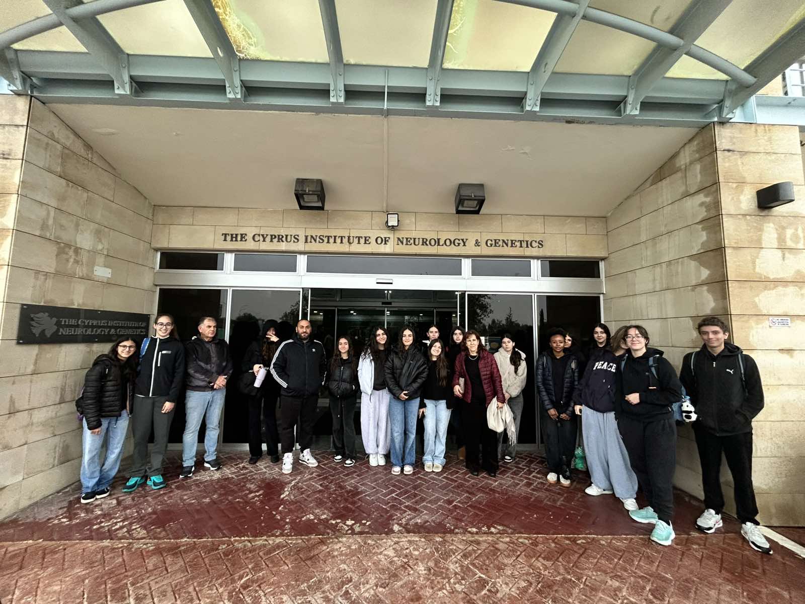 Ο όμιλός μας επισκέφθηκε το Ινστιτούτο Νευρολογίας και Γενετικής Κύπρου, το οποίο είναι κέντρο αριστείας στη νευρολογία, τη γενετική, τις ιατρικές και βιοϊατρικές επιστήμες. Αρχικά, μας έγινε παρουσίαση του Ινστιτούτου και εισαγωγή στο DNA. Μάθαμε για την καθοριστική λειτουργία του Ινστιτούτου στην αναγνώριση θυμάτων, την εξακρίβωση πατρότητας, την αναγνώριση λειψάνων αγνοουμένων και την ανάλυση αστυνομικών τεκμηρίων. Έπειτα, επισκεφθήκαμε δυο εργαστήρια. Το πρώτο αφορούσε τη μελέτη της μυοτονικής δυστροφίας, ενώ το δεύτερο ήταν εργαστήριο νευροεπιστημών, εξειδικευμένο στη γονιδιακή θεραπεία αποκατάστασης της μυελίνης. Ακόμη, καταφέραμε να δούμε μέσα από παράθυρο ποντίκια που χρησιμοποιούνταν στις έρευνες. Γενικά, η επίσκεψή μας ήταν πολύ εποικοδομητική, καθώς μάθαμε περισσότερα πράγματα για τον τομέα της βιολογίας και της γενετικής.