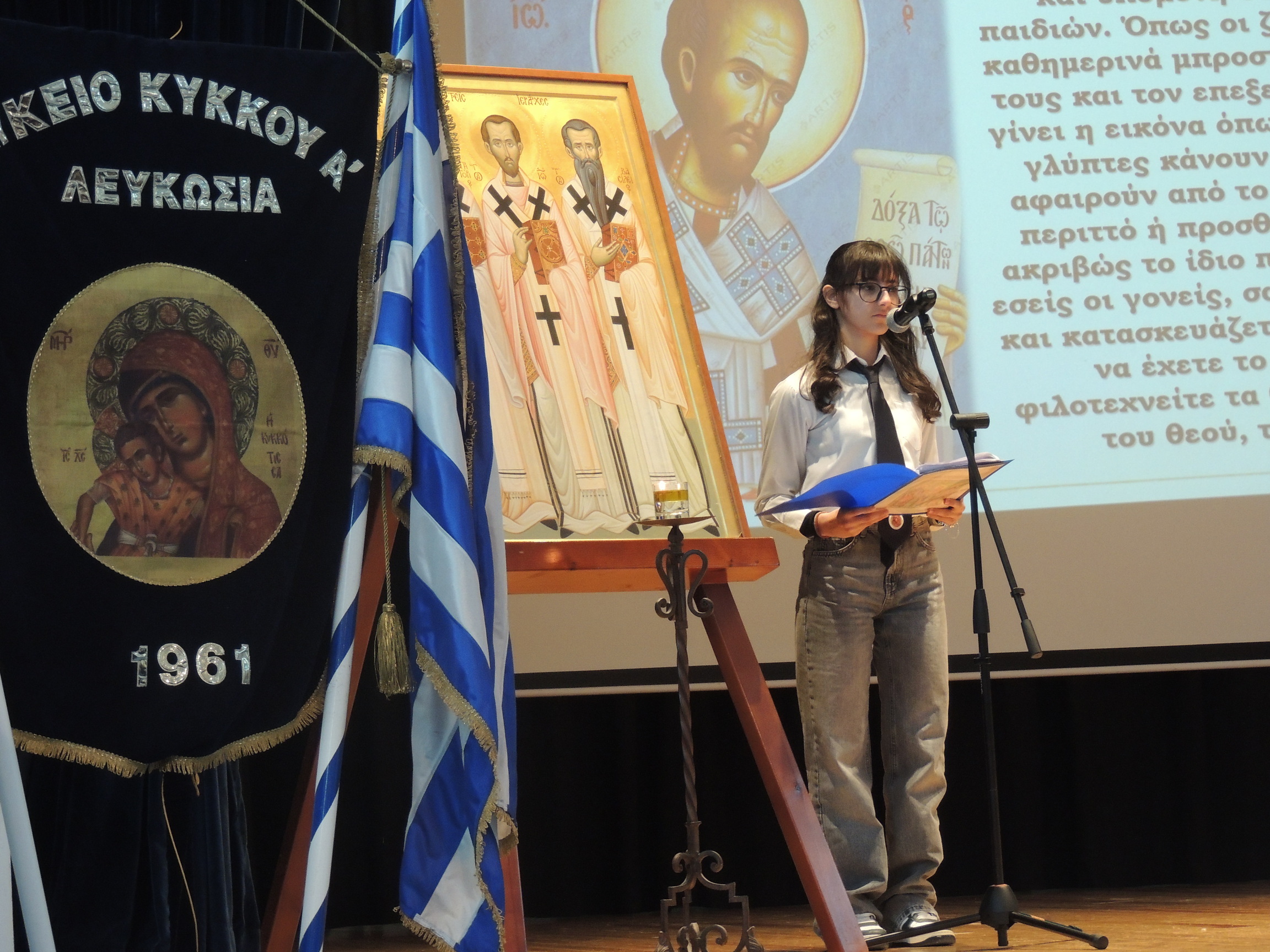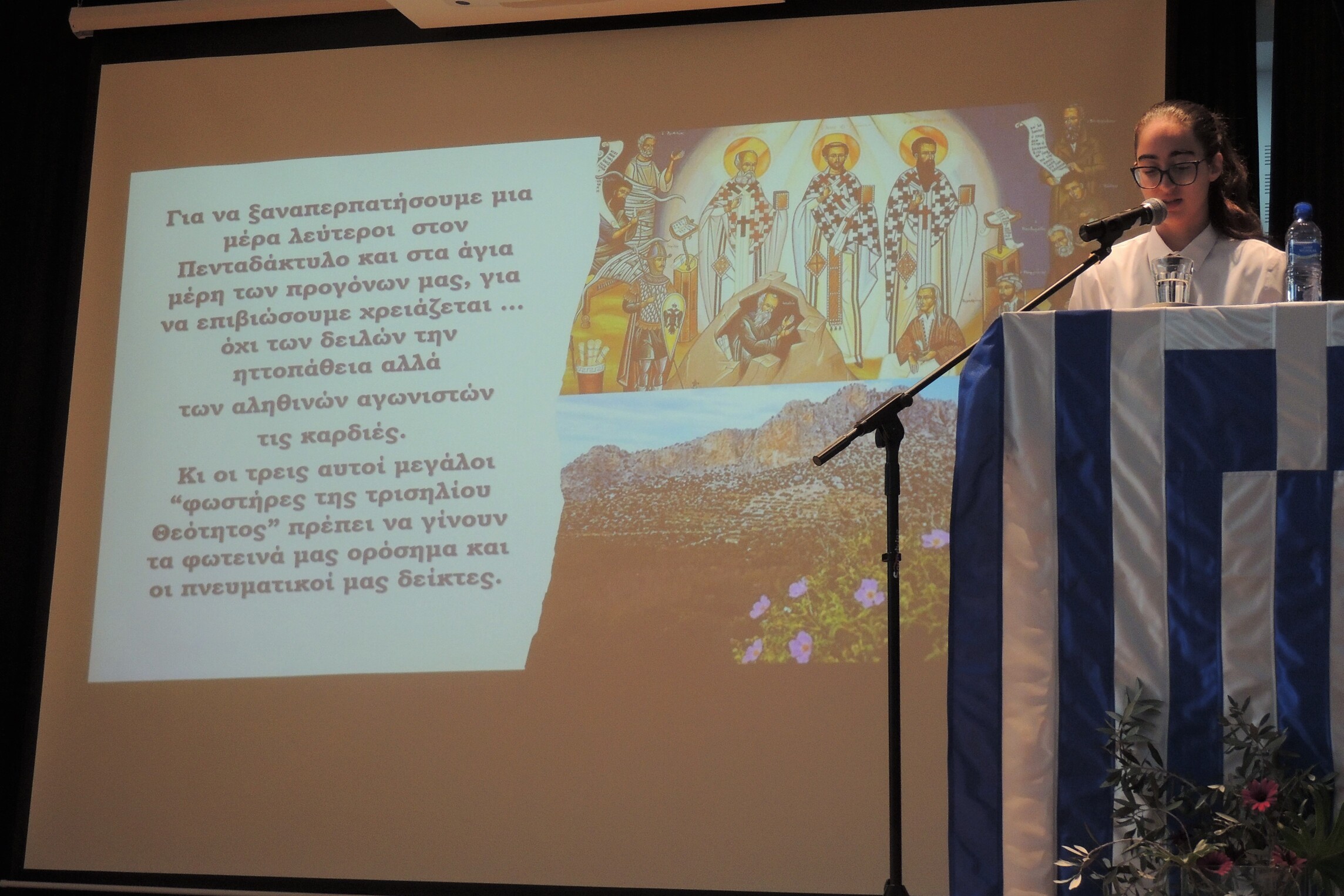 Στις 29 Ιανουαρίου 2026 πραγματοποιήθηκε ενδοσχολική εκδήλωση για τον εορτασμό των Τριών Ιεραρχών και των Ελληνικών Γραμμάτων. Στην εκδήλωση παρουσιάστηκε ο βίος και το έργο των Αγίων Βασιλείου, Γρηγορίου του Θεολόγου και Ιωάννη του Χρυσοστόμου μέσα από απαγγελίες και τραγούδια από τους μαθητές. Ομιλητής ήταν ο Ομότιμος Καθηγητής του Εθνικού Καποδιστριακού Πανεπιστημίου Αθηνών, κ. Νίκος Νικολαΐδης. Ήταν μια ευκαιρία για όλους να στοχαστούν γύρω από τις αξίες της γνώσης, της αρετής και της προσφοράς που πρέσβευαν οι Τρεις Ιεράρχες και τα Ελληνικά Γράμματα γενικότερα.